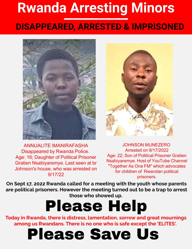 Rwanda Arresting Minors. On Sept 17, 2022 Rwanda called for a meeting with the youth whose parents are political prisoners. However the meeting turned out to be a trap to arrest those who showed up.