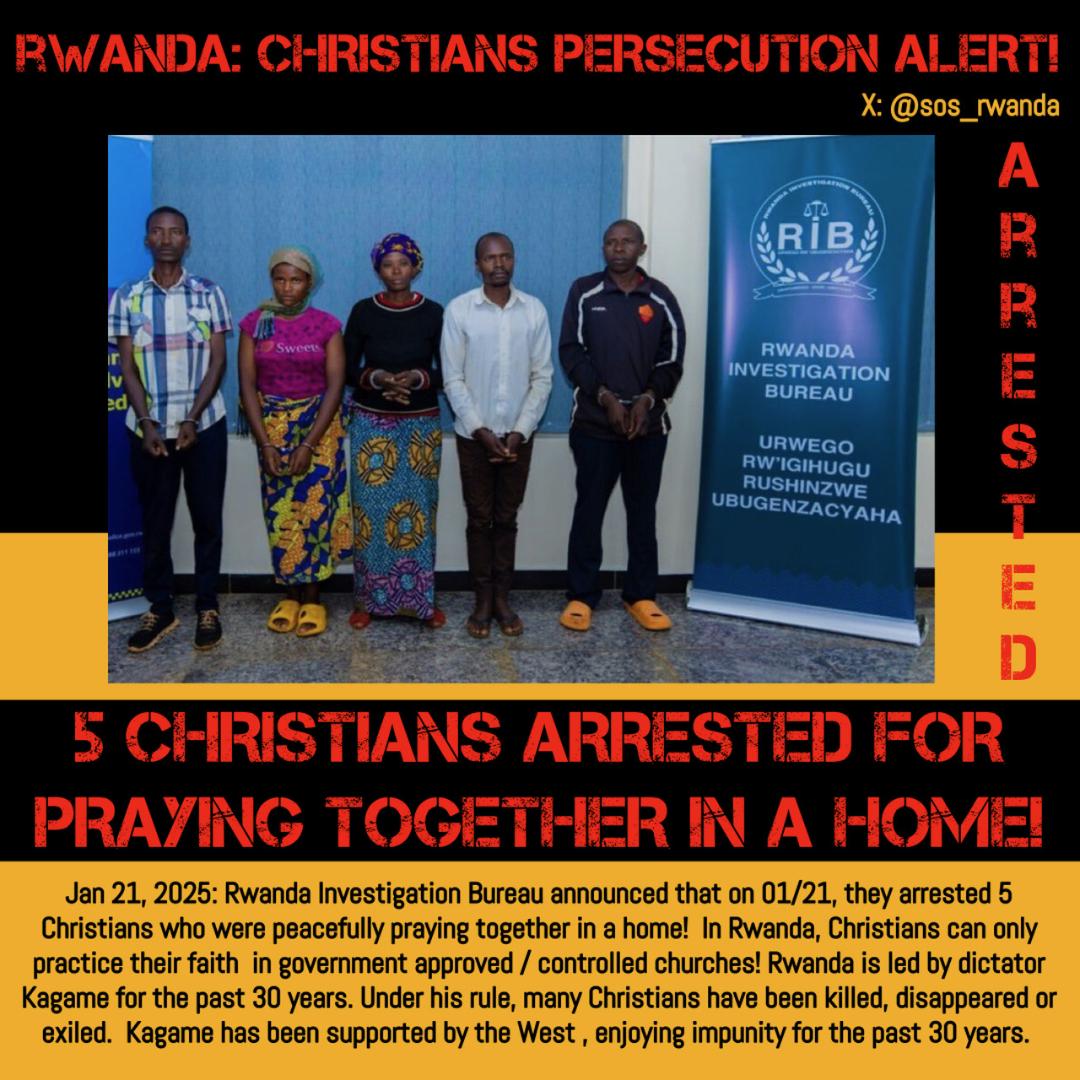 Rwanda Investigation Bureau has arrested 5 Christians for meeting and praying together in the home of one of them. Kagame regime prohibits Christians from meeting freely & praying from their home; they are only allowed to pray where they are controlled by Kagame’s regime, only inside churches approved by the government.