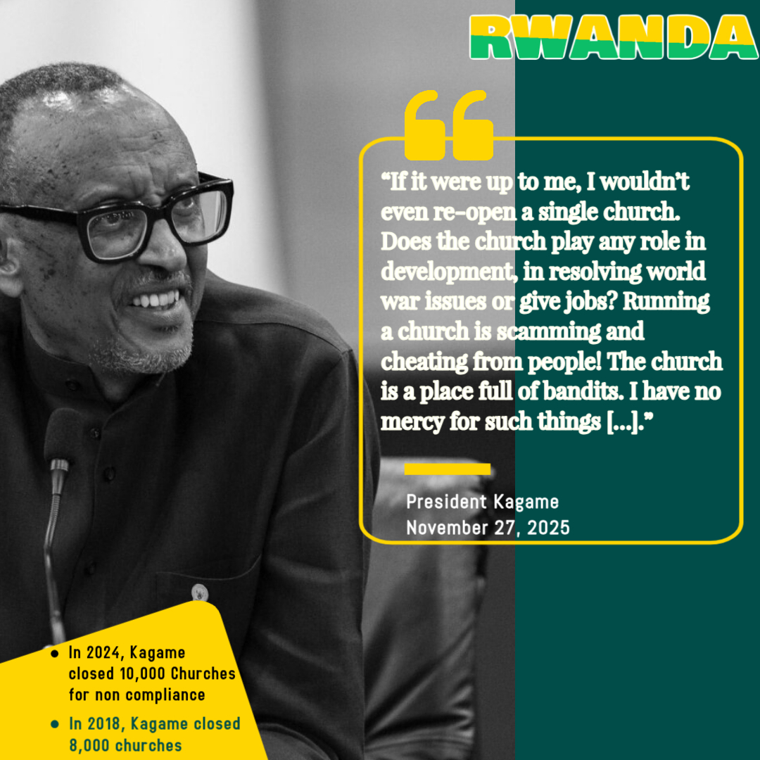 ON NOVEMBER 27, 2025 KAGAME SAID: “If it were upto me, I wouldn’t even re-open a single Church… The church plays no role in the country development nor in resolving world war issues. Does the church contribute to the growth of job market? Churches are only full of predatory actors and most of churches are scamming and cheating. What I see is that the church is only a place full of banditry. Fighting with those bandits, I have no mercy for that!